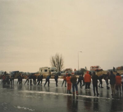 Met man en macht hebben we gewerkt om het ijs weer schoon te krijgen. Het hele bedrijf hielp mee om te vegen. Zodat de tocht – zonder vertraging – door kon gaan.